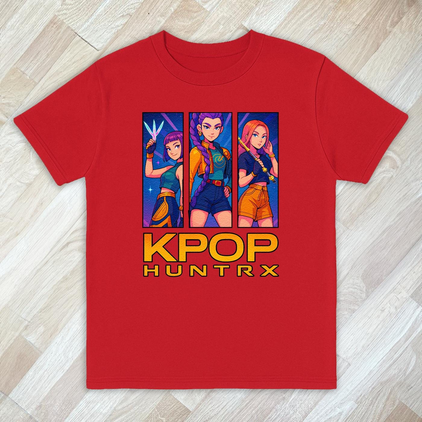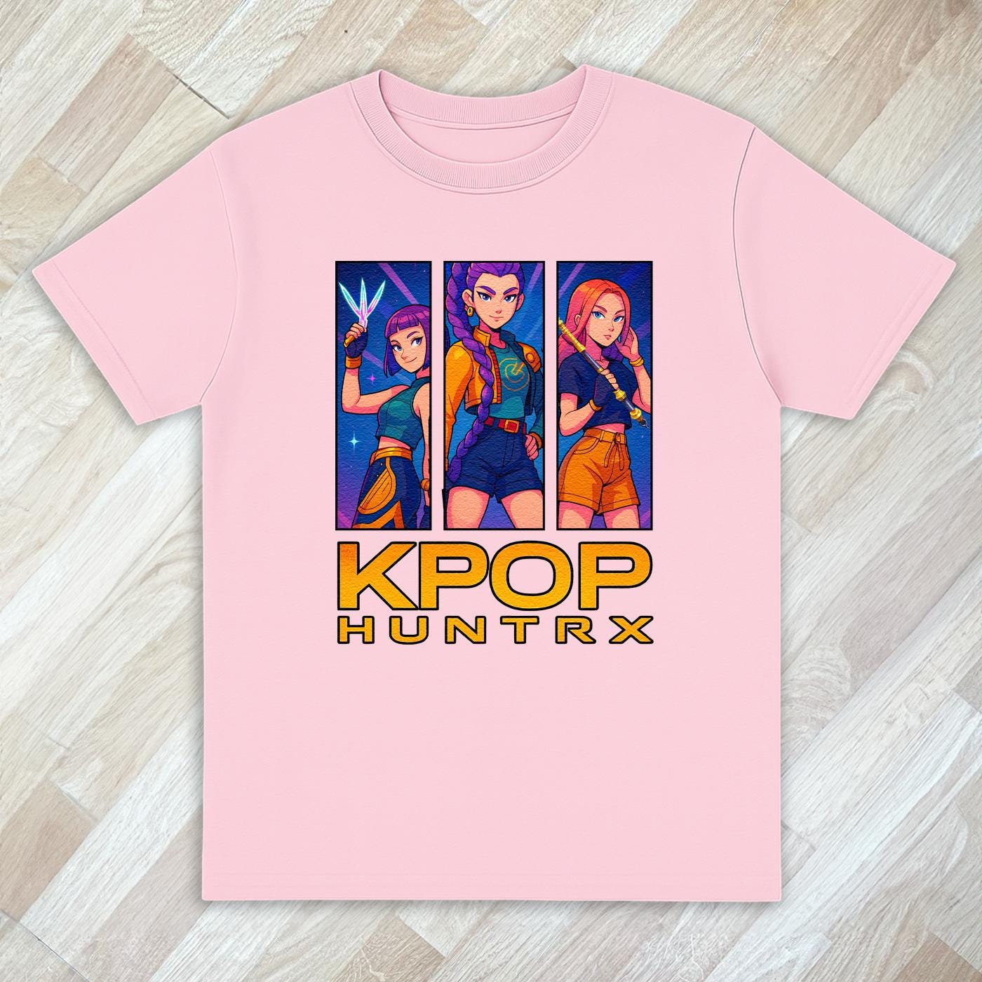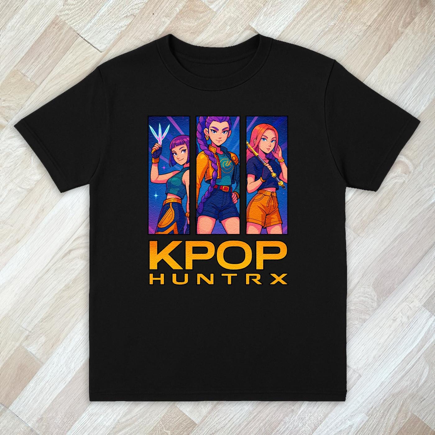Bring bold style and anime-inspired energy to your wardrobe with this “Huntrix” graphic tee, featuring a dynamic K-style idol action aesthetic.