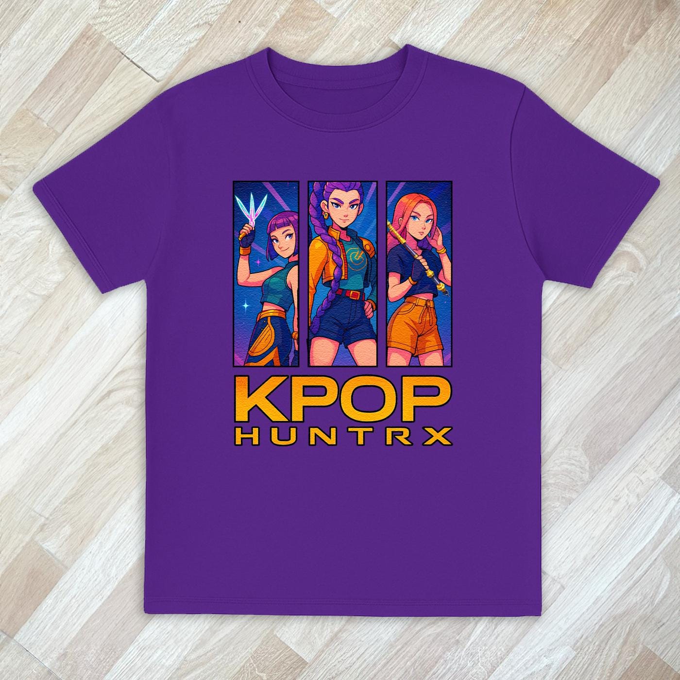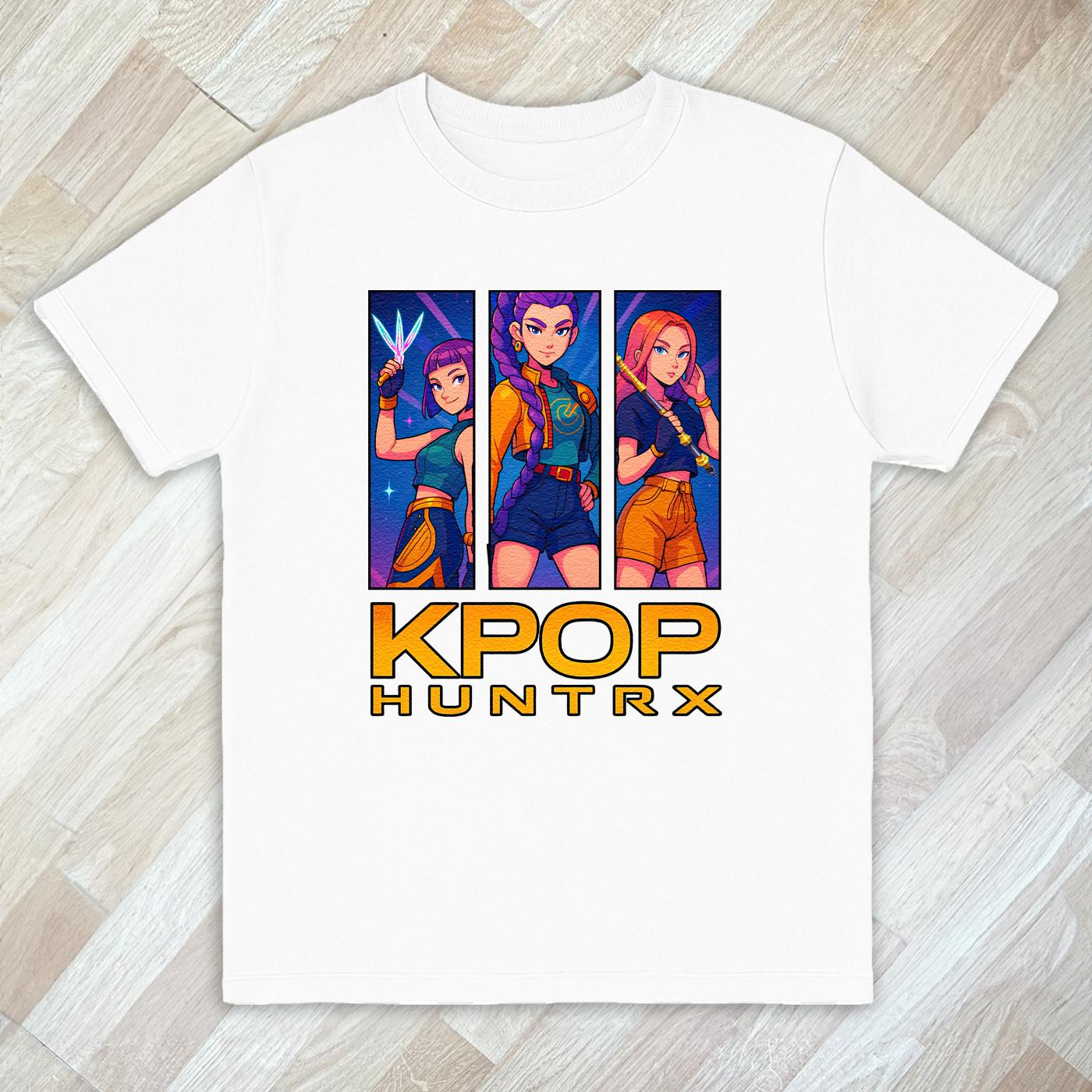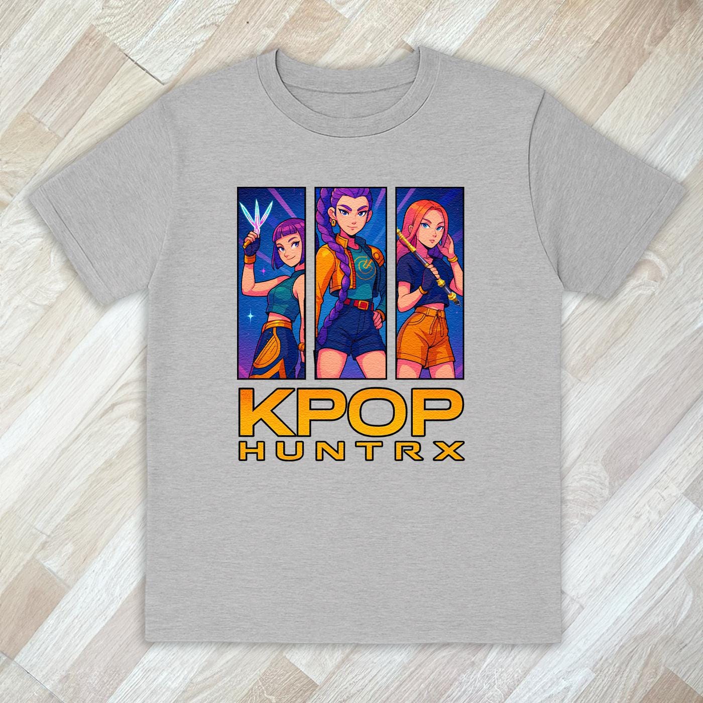 Bring bold style and anime-inspired energy to your wardrobe with this “Huntrix” graphic tee, featuring a dynamic K-style idol action aesthetic.